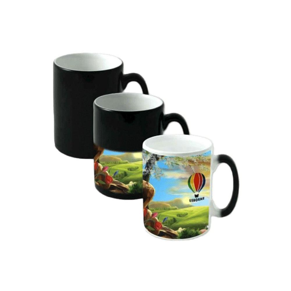 La taza es de color negro en frio, y cuando se agrega líquido caliente la misma cambia a color blanco dejando ver la imagen que tiene sublimada.